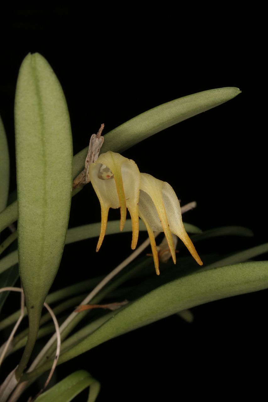 Found in western Colombia and western Ecuador in cloud forests at elevations of 650 to 1800 meters as a mini-miniature sized, warm to cool growing epiphyte with slender, erect ramicauls enveloped basally by 2 to 3 tubular sheaths and carrying a single, apical, erect, coriaceous, narrowly elliptical, subacute, gradually narrowing below into the indistinct, subpetiolate base leaf that blooms in the winter and spring on a erect, round in cross-section, 2 to 2.8" [5 to 7 cm] long, simultaneously 2, occasionally single flowered inflorescence arising from low on the ramicaul with a bract above the base and tubular, imbricating floral bracts