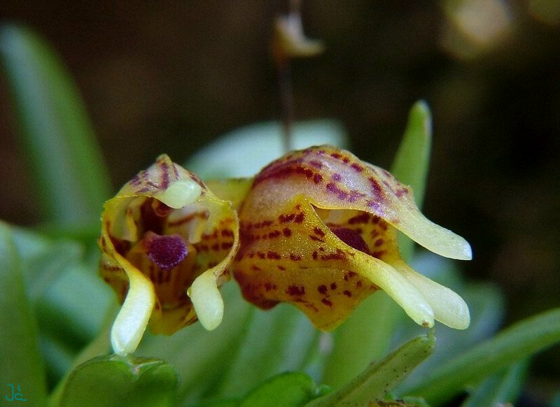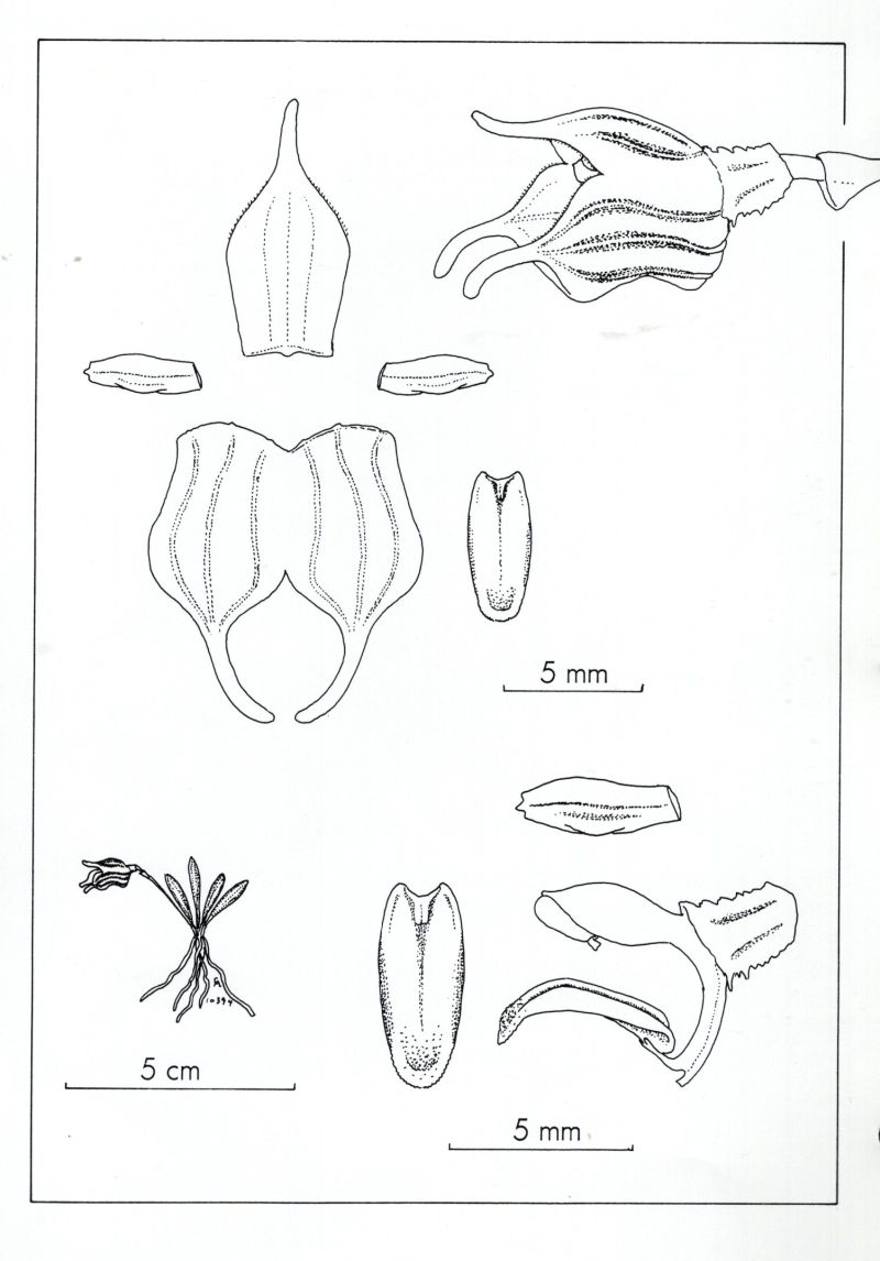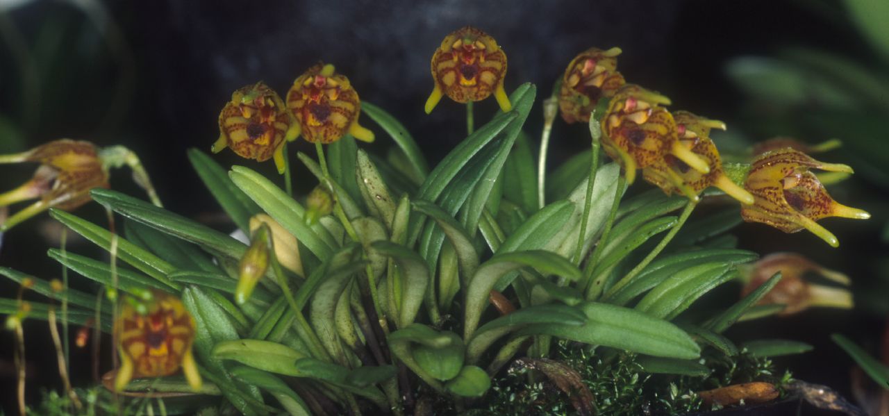 Found in west central Colombia and southeastern Ecuador on tiny branches of short trees in wet cloud forests at elevations of 1500 to 2600 meters as a mini-miniature sized, cool to cold growing epiphyte with slender, suberect ramicauls enveloped basally by 2 to 3 thin, tubular sheaths and carrying a single, apical, coriaceous, narrowly obovate, subacute, gradually narrowing below into the subpetiolate base leaf that blooms in the spring and summer on a slender, weak, suberect, .4 to .6 " [1 to 1.5 cm] long, single flowered inflorescence arising from low on the ramicaul with a bract near the base and a thin, infundibular floral bract.