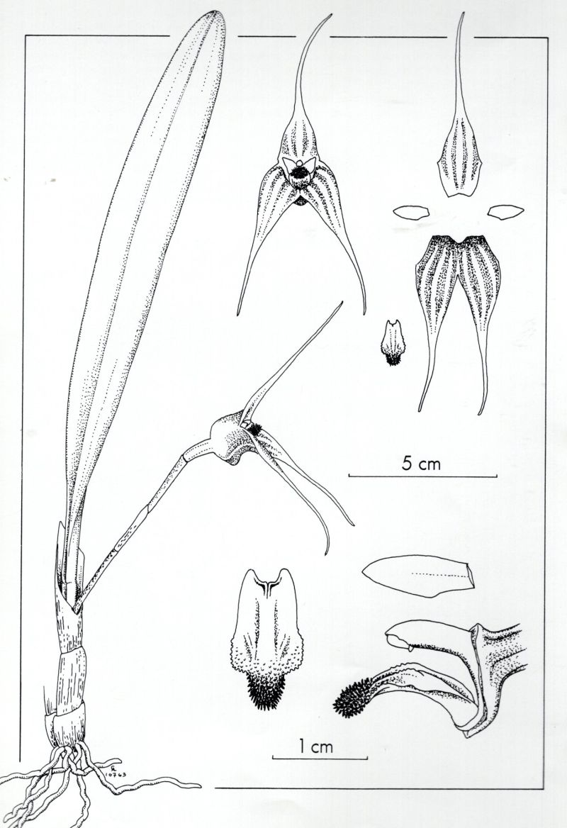 Found in Loja province of Ecuador in tall forests at elevations around 2500 meters as a small sized, cold growing epiphyte with stout, erect to suberect ramicauls enveloped basally by 2 to 3 loose, tubular sheaths and carrying a single, apical, erect to suberect, coriaceous, subconduplicate, narrowly oblong, obtuse, cuneate below into the indistinct, subpetiolate base leaf that blooms in the spring on a suberect, stout, 1.6 to 3.2" [4 to 8 cm] long, single flowered inflorescence arising from low on the ramicaul with a basal bract and a tubular floral bract.