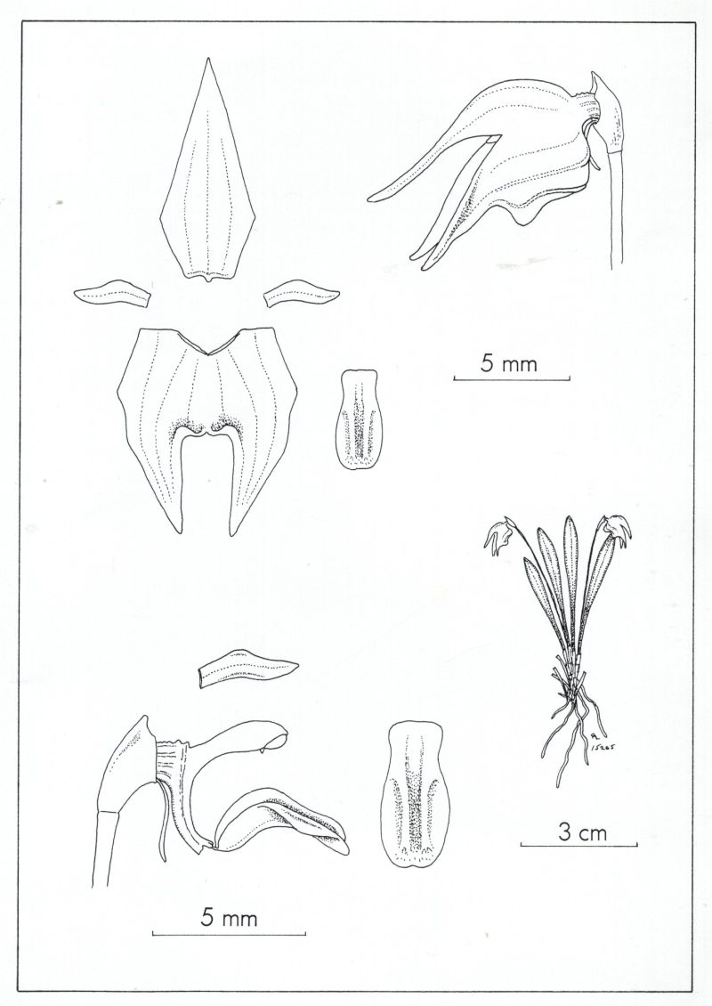 Found in Antioquia department of Colombia in cloud forests at elevations around 2600 meters as a mini-miniature sized, cold growing epiphyte with erect, slender ramicauls enveloped basally by 2 to 3, tubular sheaths and carrying a single, apical, erect, coriaceous, narrowly elliptical to obovate, subacute to acute, gradually narrowing below into the petiolate base leaf that blooms in the spring on an erect, slender to 1.2 to 1.4" [3 to 3.5 cm] long, single flowered inflorescence arising from low on the ramicaul with a tubular bract near the base and oblique floral bracts.