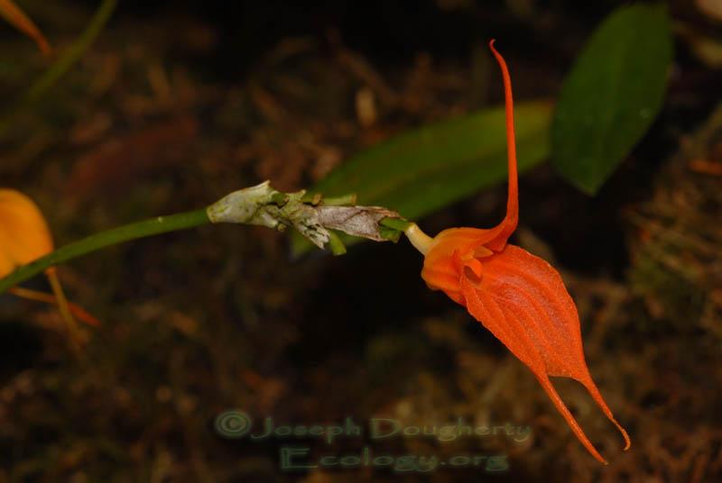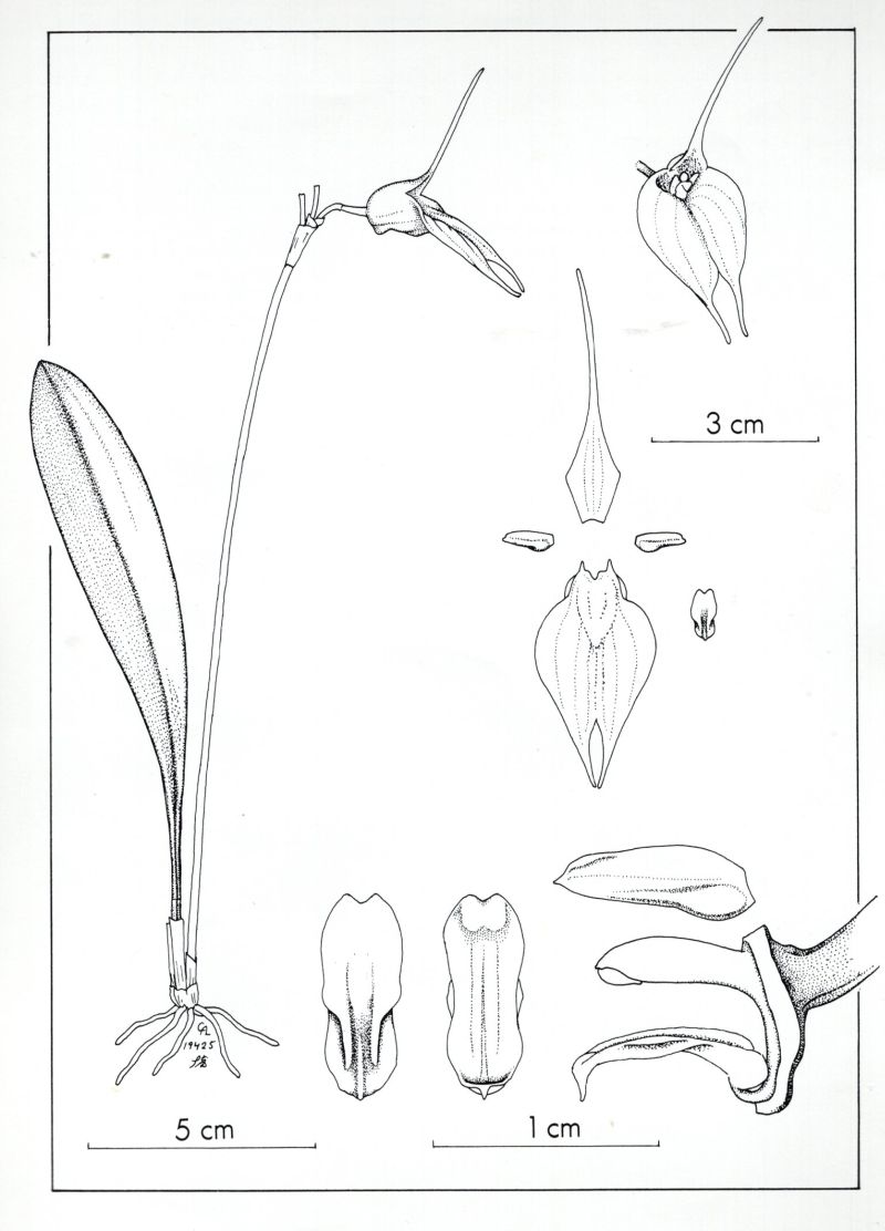 Found in southern Ecuador at elevations around 1000 meters as a miniature to small sized, warm growing epiphyte with slender, erect, ramicauls enveloped basally by 2 to 3 tubular sheaths and carrying a single, apical, erect, coriaceous, narrowly obovate, obtuse, cuneate basally into the petiolate base leaf that blooms on a erect, slender, triquetrous, racemose, singly successively few flowered 6 to 7" [15 to 17.5 cm] long inflorescence arising from low on the ramicaul with tubular, imbricating floral bracts.