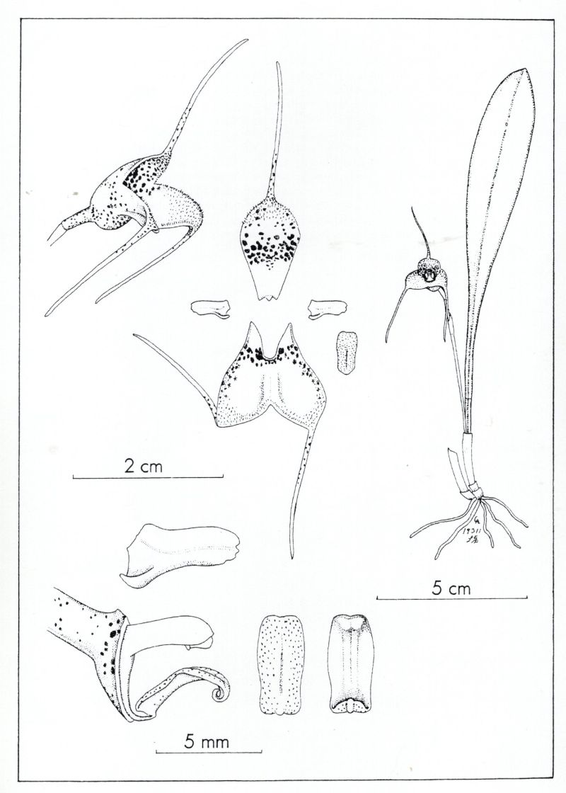 Found in the department of Cuzco Peru in cold wet cloud forests at elevations around 2750 meters as a miniature sized, cold growing epiphyte with a slender, erect ramicaul enveloped by a loose tubular sheath and carrying a single, apical, erect, coriaceous, narrowly elliptic, subacute, narrowly cuneate below into theelongate petiolate base leaf that blooms in the winter on an erect, 2.2" [5.5 cm] long, single flowered infloresccence arising from low on the ramicaul with a bract above the base