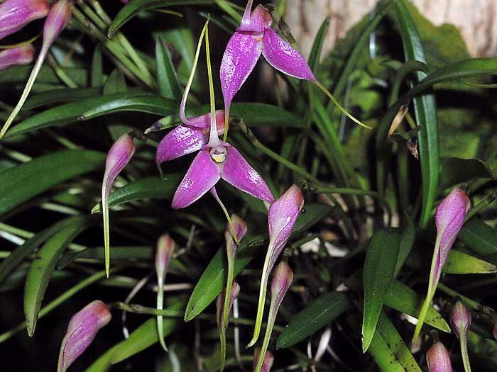Found in Ecuador and northern Peru in cloud forests at elevations around 1000 to 2000 meters as a mini-miniature sized, cool growing epiphyte with slender, erect ramicauls enveloped basally by 2 to 3 thin, tubular sheaths carrying a single, apical, erect, coriaceous, narrowly elliptic, acute leaf with the base narrowly cuneate into the petiole. Blooming in the spring on a shorter than the leaves, 3 1/5" to 4 3/5" [8 to 9 cm] long, slender, erect, single flowered inflorescence arising from low on the ramicaul with a bract near the base and a tubular floral bract that has the flower held near mid-leaf.