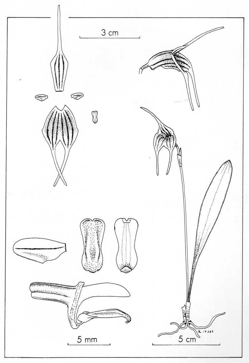 Found in Costa Rica without collection data as a mini-miniature sized, warm to cool growing epiphyte with erect ramicauls enveloped by 2 to 3 tubular, loose sheaths and carrying a single, apical, erect, coriaceous, narrowly obovate, subacute to obtuse, gradually narrowing below into the elongate, channeled, petiolate base leaf that blooms in the spring on a slender, congested, erect, 3.6 to 4.4" [9 to 11 cm] long, successively single, few flowered inflorescence arising from low on the ramicaul with a bract near the base and a tubular floral bract