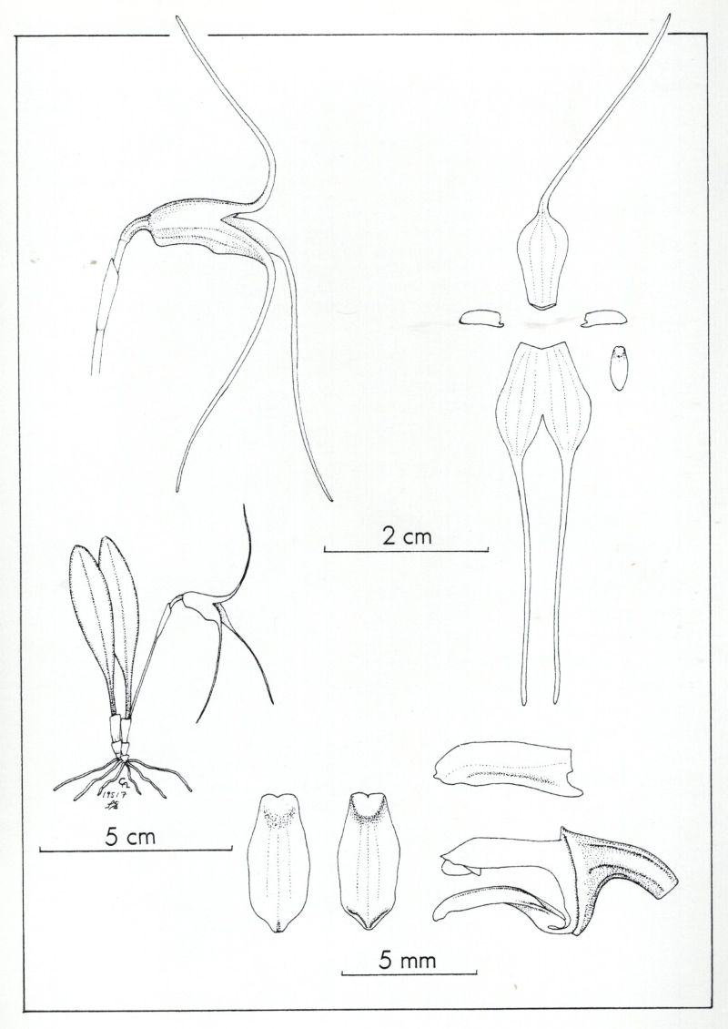 Found in southeastern Ecuador at elevations around 1800 meters meters as a mini-miniature sized, cool growing epiphyte with stout, blackish, erect ramicauls enveloped basally by 2 to 3 thin, tubular sheaths and carrying a single, apical, erect, coriaceous, narrowly elliptic, subacute to obtuse, gradually narrowing below into the slender, petiolate base leaf that blooms in the winter on an erect, slender, .6 to 1" [1.5 to 2.5 cm] long, single flowered inflorescence arising from low on the ramicaul with a thin basal bract and a tubular, thin floral bract.