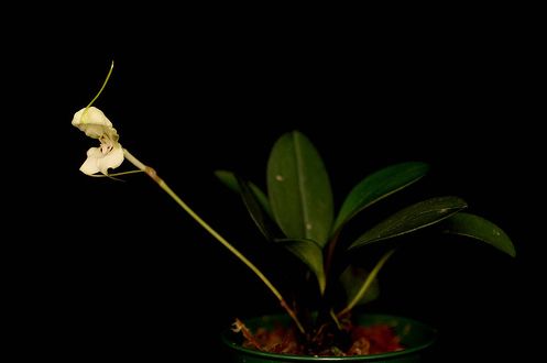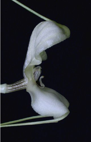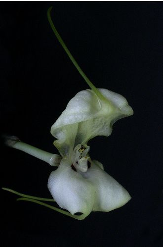 Found in southeastern Peru at elevations around 1900 meters as a mini-miniature sized, cool growing epiphyte with erect, slender ramicauls enveloped by 2 to 3 loose, tubular sheaths and carrying a single, apical, erect, coriaceous, elliptical, subacute, cuneate below into the petiolate base leaf that blooms in the fall on a slender, erect, 3.2" [8 cm] long, single flowered inflorescence arisinf from low on the ramicaul with a bract near the base and has a tubular floral bract.