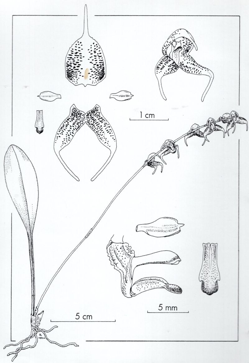 Found in Narino department of Colombia, western Ecuador and northwestern Peru at elevations of 1350 to 3100 meters as a miniature sized, cool to cold growing terrestrial or epiphyte with erect, slender ramicauls enveloped basally by 2 to 3 loose, tubular sheaths and carrying a single, apical, erect, coriaceous, long-petiolate, elliptic, subacute to obtuse leaf that is cuneate below into the slender petiole and blooms in the summer on a erect to suberect, loosely simultaneously several [4 to 9] flowered, 6 to 10" [15 to 25 cm] long, racemose inflorescence arising from low on the ramicaul with 2 bracts below the raceme and an inflated floral bract.