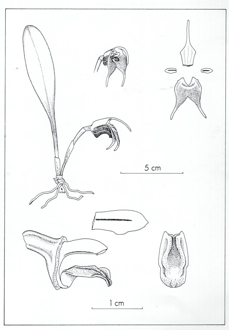 Found in Peru at elevations around 2300 meters as a mini-miniature sized, cold growing epiphyte with slender, erect ramicauls enveloped basally by 2 to 3 tubular sheaths and carrying a single, apical, erect, coriaceous, elliptical-oblong, obtuse, cuneate below into the petiolate base leaf that blooms in the spring on a slender, erect, 4 1/4" to 6.2" [11 to 16 cm] long, single flowered inflorescence arising from above the base of the ramicaul, with a thin bract on the lower third and a tubular floral bract