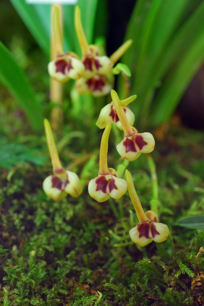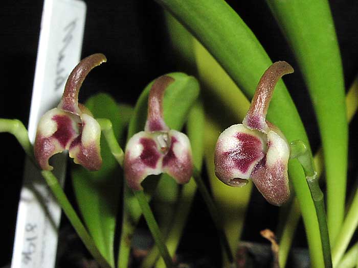 Found in Colombia, Panama and Costa Rica that likes a humid environment and is found at altitudes below 1000 meters as a mini-miniature sized, hot to warm loving epiphyte with erect, slender ramicauls enveloped basally by 2 to 3, close, tubular sheaths carrying a single, apical, erect, coriaceous, narrowly elliptical to obovate, obtuse to rounded apically leaf that gradually narrows into an indistinct petiolate base and blooms in the winter and spring on a suberect to erect, slender, 1 3/5" to 2 2/5" [4 to 6 cm] long inflorescence arising from low on the ramicaul with a tubular bract above the middle, a tubular floral bract and a successively single, showy, sweetly fragrant flower held below leaf height.