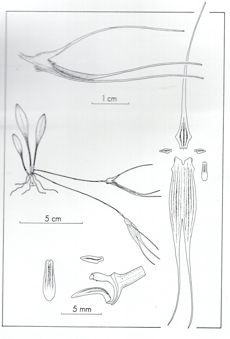 Found in Ecuador and Peru in moist intermontane valleys of the lower reaches of the dry sierra at elevations of 1750 to 1890 meters as a mini-miniature sized, cool growing, caespitose epiphyte with 1 to 1.5" [2.5 to 3.75 cm] long, blackish, erect, slender ramicauls enveloped basally by 2 to 3 tubular, sheaths carrying a single, apical, erect, coriaceous, elliptical, acute leaf that is cuneate below into the blackish petiole from which a slender, terete, 1.2" to 3" [3 to 7.5 cm] long, inflorescence arising from low on the ramicaul with a bract near the base and a tubular floral bract with a single, large for the plant, flower held at leaf height all occuring in the spring. This species is separated from others by the "V"-shaped median furrow of the labellum which also has the lateral margins slightly revolute, the prominent purple veins on the sepals and the long caudae.