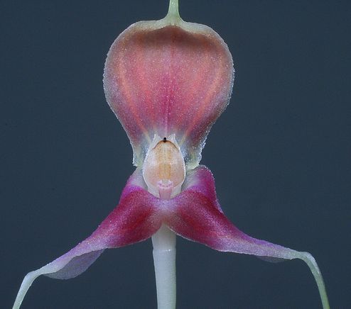 Found in Antioquia department of Colombia, Ecuador and Peru around 1600 to 2400 meters as a miniature sized, cool to cold growing epiphyte with erect, slender, blackish ramicauls enveloped by 2 to 3, loose tubular sheaths and carrying a single, apical, erect, coriaceous, elliptical, obtuse, cuneate below into the elongate, blackish petiolate base leaf that blooms in the spring on a an erect to suberect, slender, 1.6 to 2.4" [4 to 6 cm] long, single flowered inflorescence arising from low on the ramicaul with a bract at the base and a tubular floral bract.