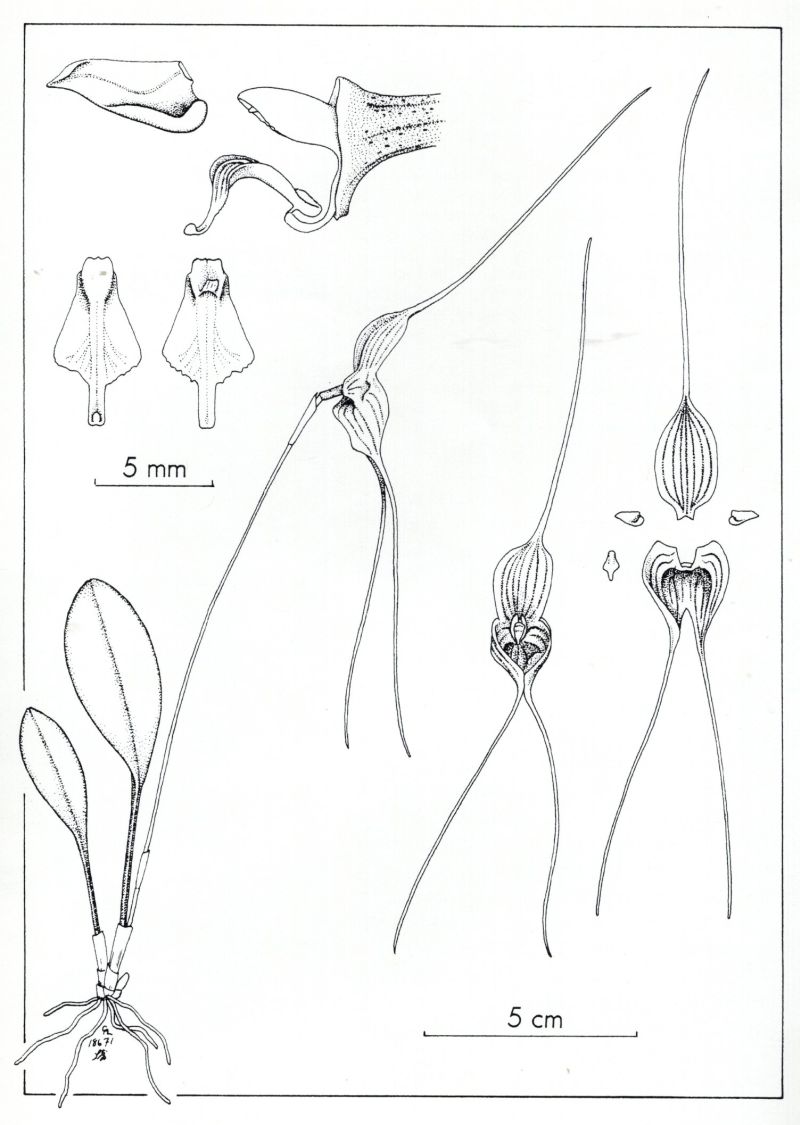 References W3 Tropicos, Kew Monocot list , IPNI ; *Icones Pleurothallidinarum Vol XVI Systematics of Pleurothallis subgenera Crocodeilanthe, Rhynchopera and Talpinaria Luer 1998 drawing fide; Icones Pleurothallidinarum XXII Systematics of Masdevallia Part 3 Luer 2001 drawing fide; Masdevallia's in Kleur Vol 1 P M Oversteegen, Eisses & A P Sijm 2001 photo fide; A Treasure of Masdevallia Vol 26 Luer & Dalstroem 2001 watercolor fide; Australian Orchid Review Vol 69 No 4 2004 photo; Orchid Species of Peru Zelenko Bermudez 2009 photo fide; Las Orquideas del Peru Izerskyy & Bezverhov 2011 photo fide; Orchids Masdevallia with its segregates including Dracula Zelenko 2014 photo fide;