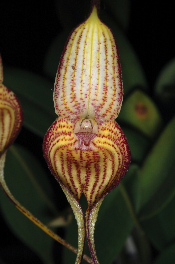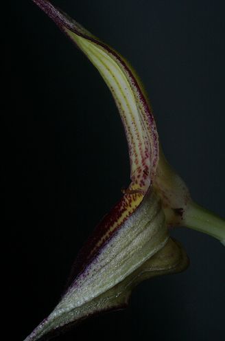 Found in Peru at elevations around 2500 meters as a mini-miniature sized, cold growing epiphyte with stout, erect, blackish ramicauls enveloped basally by 2 to 3 loose, tubular sheaths and carrying a single, apical, erect, coriaceous, long-petiolate, elliptical, obtuse leaf that is cuneate below into the blackish petiole and blooms on a slender, erect to suberect, 4 3/4" [12 cm] long, single flowered inflorescence arising from near the middle of the ramicaul and having a bract near the base and a tubular floral bract that blooms in the fall and winter