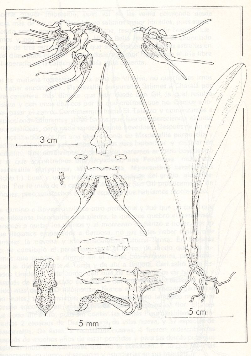 Found in northeastern Colombia in scrub cloud forests at elevations of 2800 to 3360 meters as a miniature, cold growing epiphyte with stout, erect ramicauls enveloped basally by 2 to 3 loose, tubular sheaths and carrying a single, apical, erect, coriaceous, ellitcal, obtuse leaf that gradually narrows into the petiole and blooms in the winter on a dense to sublax, to 2 3/4" [to 7cm] long, few to several [2 to 6] simultaneously flowered,, triquetrous, racemose inflorescence with a basal bract and thin, imbricating, oblique floral bracts. Can be confused with M sceptrum yet has longer pedicels and shortly connate sepals with somewhat revolute, free margins.