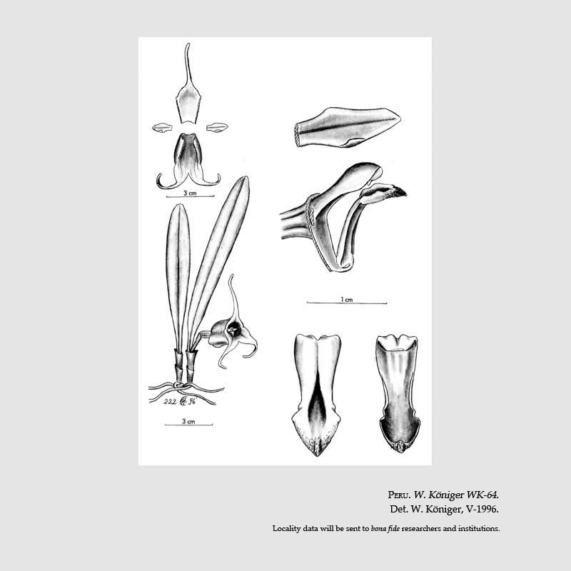 Found in Amazonas department of Peru at elevations around 2300 meters as a miniature sized, cold growing epiphyte with slender, erect ramicauls enveloped by 2 to 3 close, tubular sheaths and carrying a single, apical, erect, thickly coriaceous, very narrowly oblong-elliptical, rounded, gradually narrowing below into the base leaf that blooms in the fall on an almost erect, terete, stout, .6" [1.5 cm] long, single flowered inflorescence with a tubular, loose, scarious, acuminate floral bract.