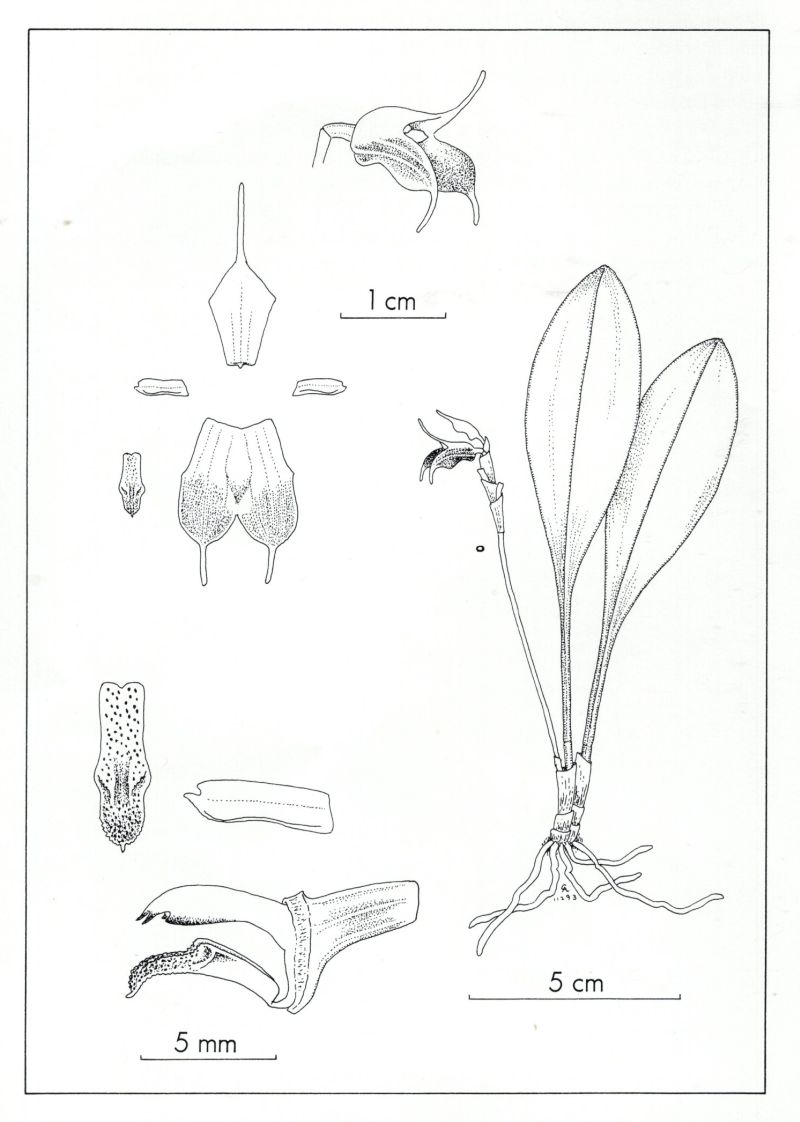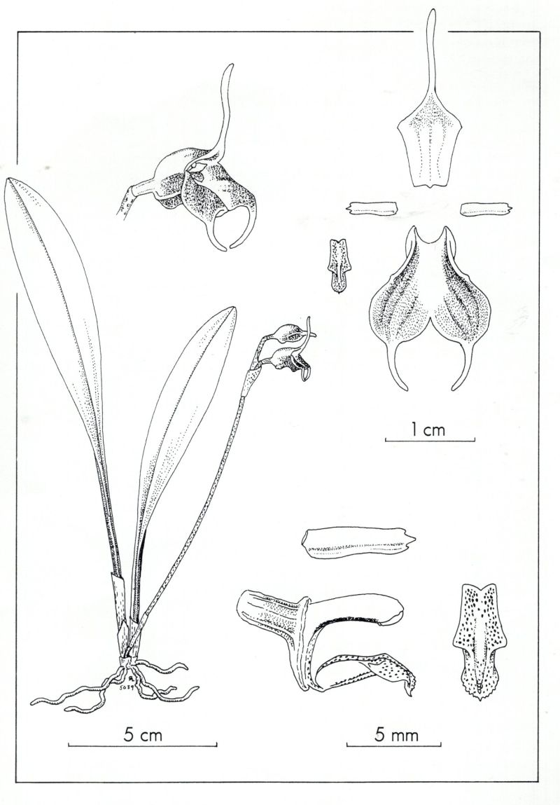 Found in Bolivia in cloud forests at elevations around 1800 meters as a small sized, cool growing epiphyte with erect, slender ramicauls enveloped basally by 2 to 3 loose, tubular sheaths and carrying a single, apical, erect, thickly coriaceous, elliptical to obovate, subacute to obtuse leaf that gradually narrows into the petiole below and blooms at any time of the year on an erect to suberect, congested, racemose, few to several [2 to 6] flowered, terete, purple flecked, 3 1/4" to 4" [8 to 10 cm] long inflorescence arising from low on the ramicaul with a bract at the base and oblique, purple flecked floral bract.