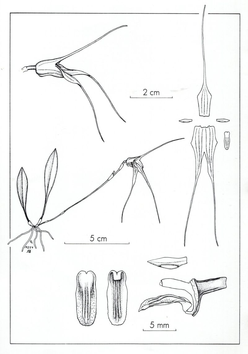 Found in southern Ecuador in cloud forests at elevations around 1600 meters as a mini-miniature sized, cool growing epiphyte with slender, erect, ramicauls enveloped basally by 2 loose, tubular sheaths and carrying a single, apical, erect, coriaceous, elliptical, acute leaf that is cuneate below into a petiole and blooms on an suberect to horizontal, slender, 1/4 to 1/3" [7 to 8 mm] long, successively few flowered inflorescence arising from low on the ramicaul and having a bract near the base and another on the lower quarter and a tubular floral bract.