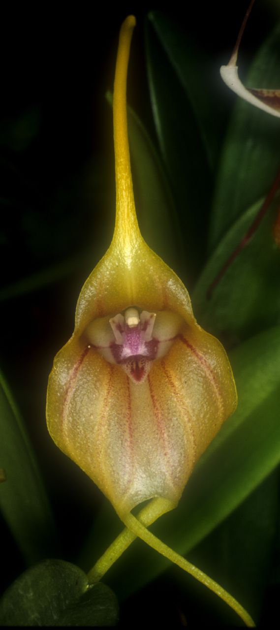 Found in Ecuador in cloud forests as an epiphyte with erect, stout ramicauls enveloped basally by 2 to 3, loose, tubular sheaths and carrying a single, apical, erect, thickly coriaceous, elliptical, obtuse, cuneate below into the petiolate base leaf that blooms in the winter on a stout, erect, 3 3/4" to 4" [9 to 10 cm] long, single flowered inflorescence arising from low on the ramicaul and carrying a tubular floral bract.