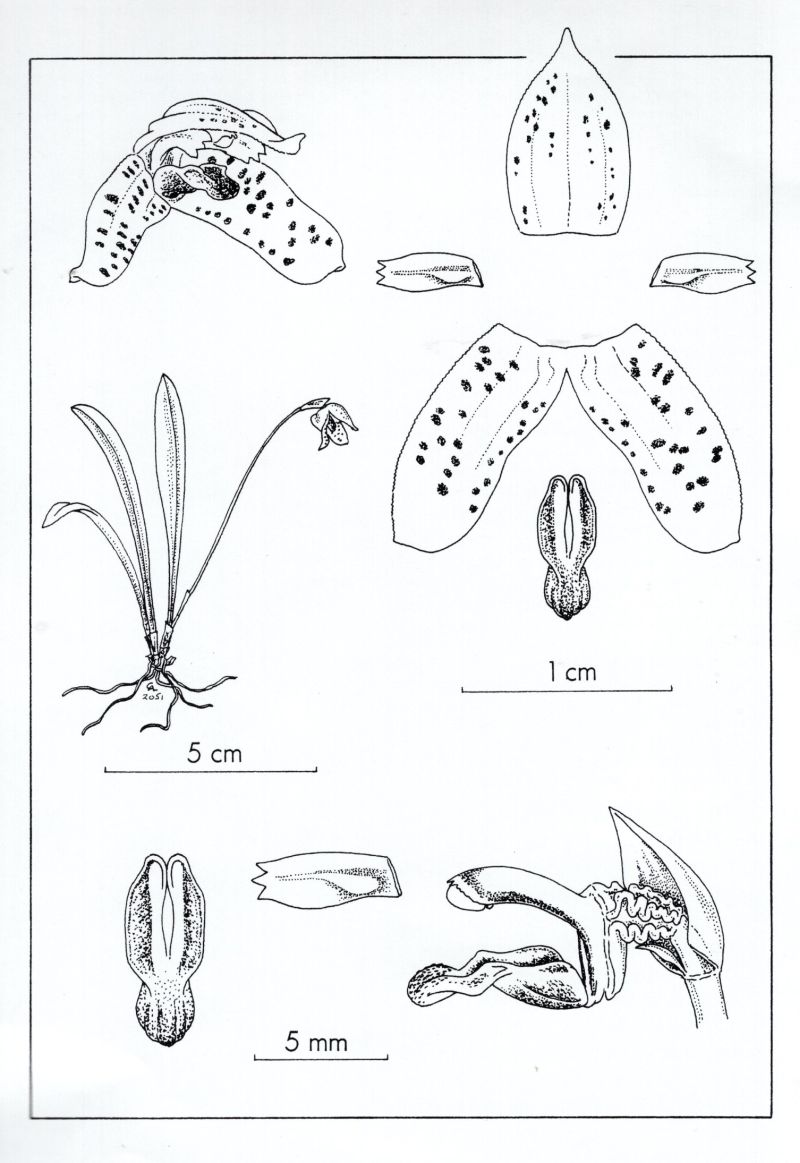 Found in El Choco' and Valle de Cauca departments of Colombia at elevations around 2000 to 2300 meters as a mini-miniature sized, cold growing epiphyte with erect, slender ramicauls enveloped by 2 to 3, thin, tubular sheaths and carrying a single, apical, erect, coriaceous, narrowly obovate, acute to subacute, gradually narrowing below into the slender, blackish petiolate base leaf that blooms in the fall through spring on an erect, slender, 2 to 4" [5 to 10 cm] long, single flowered inflorescence arising from low on the ramicaul with a bract above the base and an inflated, tubular, floral bract.