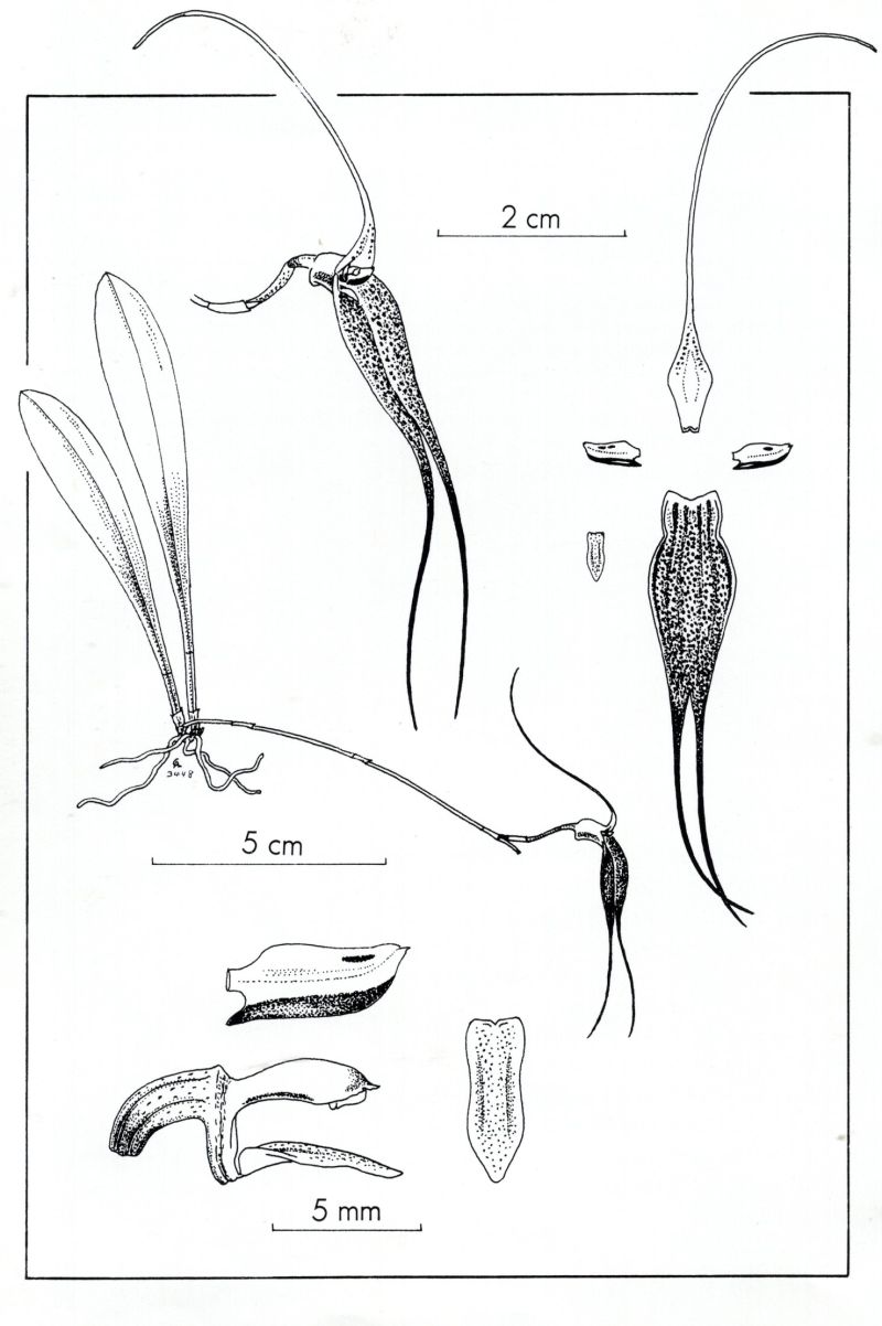 Found only in western Ecuador in seasonally dry montane cloud forests at elevations of 100 to 700 meters as a mini-miniature sized, hot to warm growing epiphyte with slender ramicauls enveloped basally by 2 to 3 short, tubular sheaths carrying a single, apical, erect to suberect, coriaceous, narrowly obovate, subacute leaf that gradually narrows below into the slender, indistinct petiole that flowers in the fall and late winter in the northern hemisphere on a slender, horizontal to descending, 2 to 3 1/5" [5 to 8 cm] long, successively few flowered, congested, racemose inflorescence arising from low on the ramicaul with a tubular floral bract.