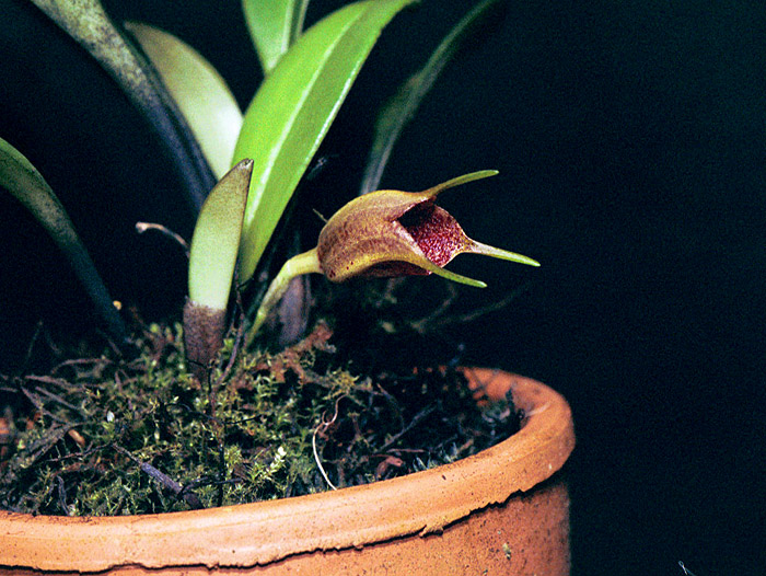 Found in central Bolivia in cloud forests at elevations of 1700 to 2100 meters and is a mini-miniature sized, cool to cold growing epiphyte with blackish, slender, erect ramicauls enveloped basally by 2 to 3 loose, tubular sheaths carrying a single, apical, erect, coriaceous, petiolate, elliptical, subacute leaf that is cuneate below into the blackish petiole that blooms on a slender, suberect, 3/5" to 1 1/5" [1.5 to 3 cm] long, single flowered inflorescence arising from low on the ramicaul and a bract above the base and a floral bract that holds the solitary flower below the leaves.