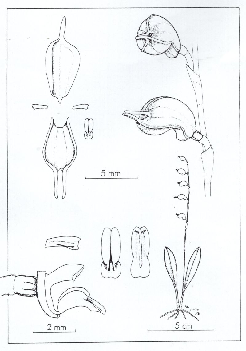 Found in Ecuador without locational data as a mini-miniature sized epiphyte with slender, erect ramicauls enveloped by a tubular sheath and another at the base and carrying a single, apical, erect, coriaceous, elliptical, subacute, cuneate below into the petiolate base leaf that blooms in the summer on a slender, erect, lax, secund, 4" [10 cm] long, simultaneously few flowered inflorescence arising from low on the ramicaul and has an oblique floral bract.