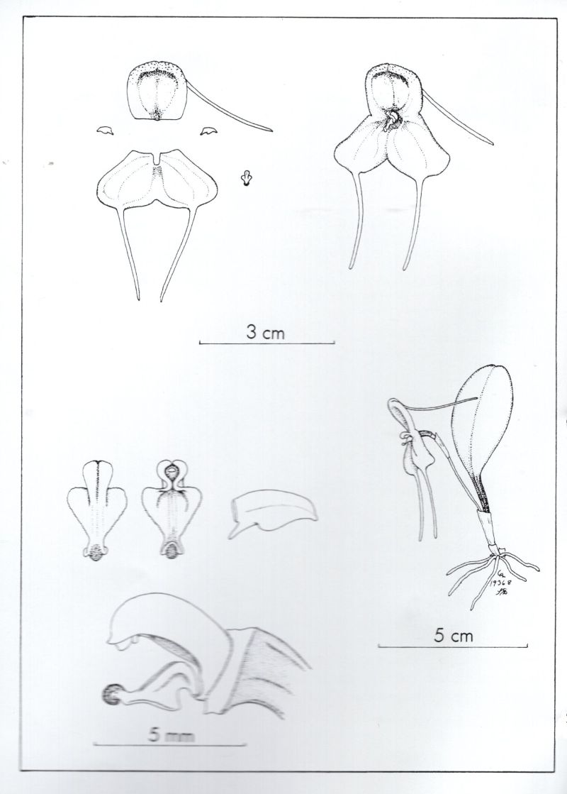 References W3 Tropicos, Kew Monocot list , IPNI ; *Icones Pleurothallidinarum Vol XX Luer 2000 drawing fide; Icones Pleurothallidinarum Vol XXIII Masdevallia Part 4 Luer 2002 drawing fide; Orchid Species of Peru Zelenko Bermudez 2009 photo fide; Orchidaceae Masdevallia and Affiliates Dodson & Luer 2009 drawing fide; Orchids Masdevallia with its segregates including Dracula Zelenko 2014 photo fide;