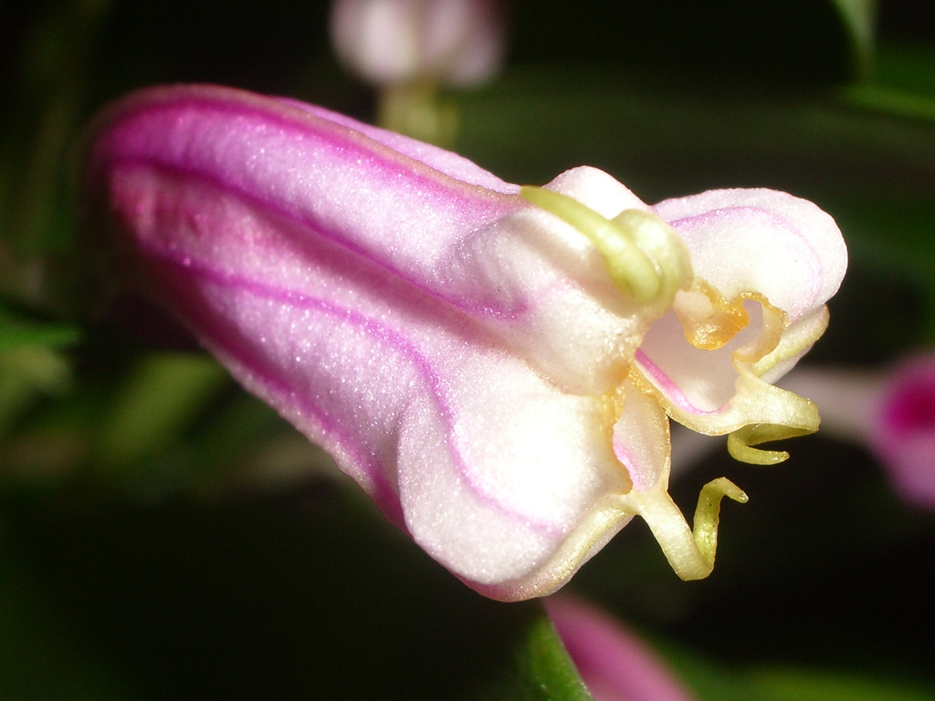 Found in Bolivia in cloud forests at elevations of 2150 to 2800 meters as a miniature sized, cold growing, epiphytic species is with slender, erect, blackish ramicauls enveloped basally by 2 to 3, tubular sheaths carrying a single, apical, erect, coriaceous, elliptical, subacute leaf that is narrowly cuneate below into the slender petiole that blooms in the spring on a slender, suberect, 1 3/4 to 2" [4 to 5 cm] long, solitary flowered inflorescence arising from low on the ramicaul with a bract above the base and a tubular floral bract that is held at or above leaf height.