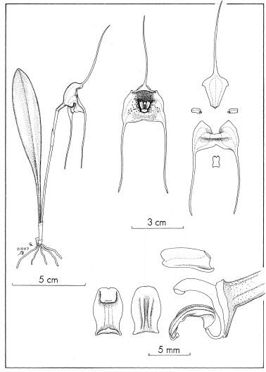 Found in Peru without locational data as a small sized, presunably epiphytic orchid with erect, stout ramicauls enveloped by a tubular sheath with 2 to 3 below and carrying a sigle, apical, erect, coriaceous, elliptical, subacute, cuneate below into the petiolate base leaf that blooms on an erect, peduncle7.2" [18 cm] long, provided with a bract below the middle, arising from low on the ramicaul, single flowered inflorescence with a tubular, shorter than the ovary floral bract.