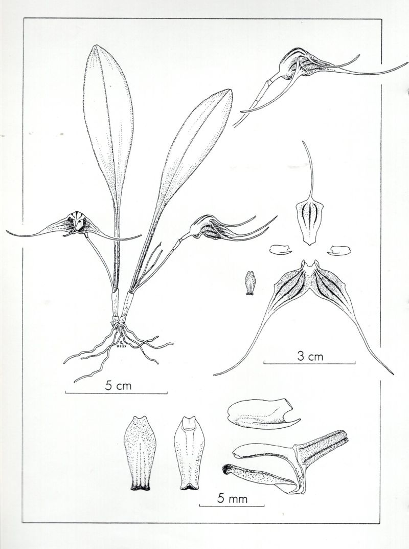 References W3 Tropicos, Kew Monocot list , IPNI ; Orquideologia Vol 16 No 1 1983 drawing fide; Systematics of Masdevallia Vol 2 Luer 1986; Icones Pleurothallidinarum XXII Systematics of Masdevallia Part 3 Luer 2001 drawing fide; Masdevallia's in Kleur Vol 1 P M Oversteegen, Eisses & A P Sijm 2001 photo fide; Orquideas Nativas del Tachira Cesar Fernandez 2003 photo fide; Libro Rojo de Plantas De Colombia Vol 6 Primera Parte Saenz 2007 photo fide; Orchids Masdevallia with its segregates including Dracula Zelenko 2014 photo fide;