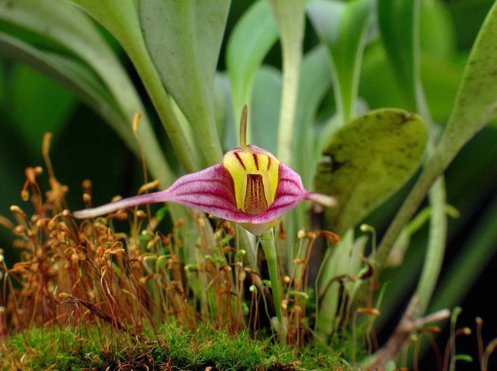 Found in northeastern Colombia in the department of Norte de Santander in cloud forests on mossy branches and trunks of small trees at elevations of 1800 to 2200 meters as a miniature sized, cool to cold growing, caespitose epiphyte with slender, blackish ramicauls enveloped basally by 2 to 3 loose, tubular sheaths carrying a single, apical, erect to suberect, coriaceous, petiolate, elliptical, acute leaf that is cuneate below into a slender, blackish petiole that blooms in the spring on a suberect, lender, 3/5" to 1 4/5" [1.5 to 4.6 cm] long, solitary flowered inflorescence arising from low on the ramicaul with a basal bract and a floral bract and the solitary, showy flower is held well below the leaves.