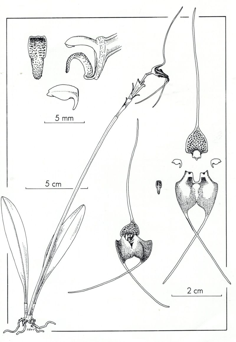 This species is characterized by having long-pedicellate inflorescence carried by a slender peduncle that is much longer than the leaf. The dorsal sepal is connate into a shallow cup from which the lateral sepals expand. All the apices of the sepal end in long, slender tails and the petals are distinct in the long descending basal process.
