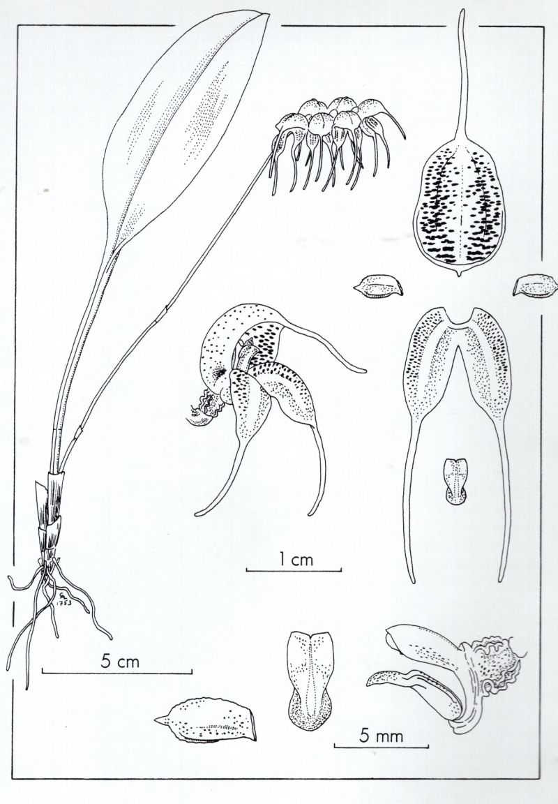 Found in western Ecuador at elevations of 2000 to 2500 meters as a small sized, cold growing terrestrial or epiphyte with erect, slender ramicauls enveloped basally by 2 to 3 loose, tubular sheaths and carrying a single, apical, erect, coriaceous, petiolate, elliotic, subacute leaf that is cuneate below into the slender, sulcate petiole and blooms in the winter, spring and summer on a slender, erect to semi-erect then horizontal congested, distichous, 10" [25 cm] long, simultaneously 6 to 9 flowered, racemose inflorescence arising from low on the ramicaul with 2 short bracts and a cucullate floral bract .