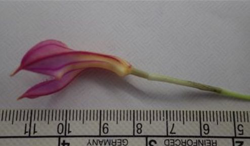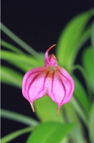 Found in Pasco department of Peru in wet montane forests at elevations of 1900 to 2000 meters as a small sized, cool growing epiphyte with short, much shorter than the leaves ramicauls carrying a single apical, oblanceolate, abruptly long-apiulacte, petioalte base leaf that blooms in the late fall on an erect, to 8" [20 cm] long, single flowered inflorescence with tubular, shorter than the pedicel floral bracts and carrying showy flowers with an ocher yellow exterior dorsal sepal with fuschia veins and yellow mottled with fuschia interior with cherry red veins, the tails dark fuschia, the pubescence hyaline, the lateral sepals exterior rose with fuschia veins, the inner surface brilliant fuschia covered with fine transluscent crystaline pubescence, the veins dark cherry red, the petals transluscent with a broad purple stripe down the center, the lip semitransluscent with ocher yellow suffusion and purple dots, the column nearly pure white, semitransluscent, the margins of the undersurface purple and the anther is transluscent white.