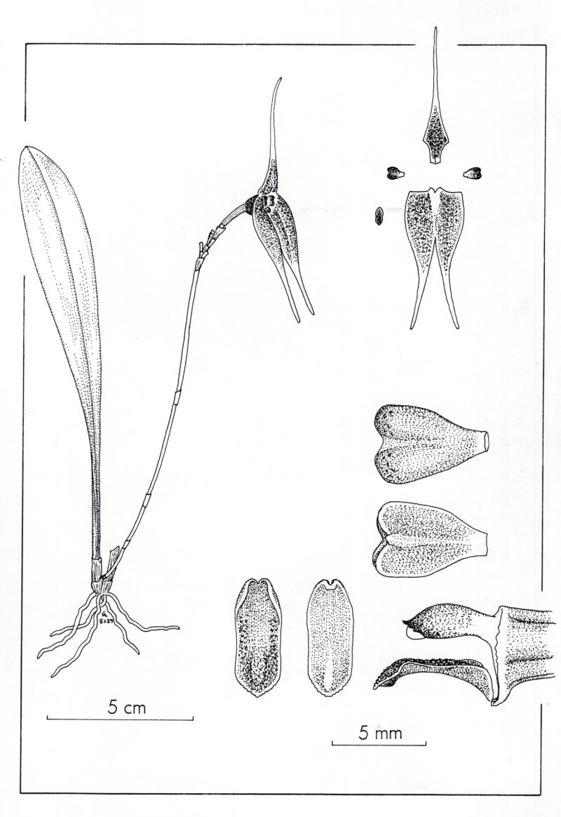 Found in Ecuador in cloud forests at elevations of 1200 to 1500 meters as a miniature sized, cool growing epiphyte with coarse roots carrying a stout, erect, ramicaul enveloped basally by 2 to 3 tubular sheaths and carrying a single, apical, erect, thickly coriaceous, narrowly obovate leaf with the apex obtuse and it gradually narrows to the subpetiolate base that blooms in the spring on a succession of single flowers on a 5" [12.5 cm] long, congested, racemose inflorescence arising from low on the ramicaul with 3 to 4 bracts and a floral bract.