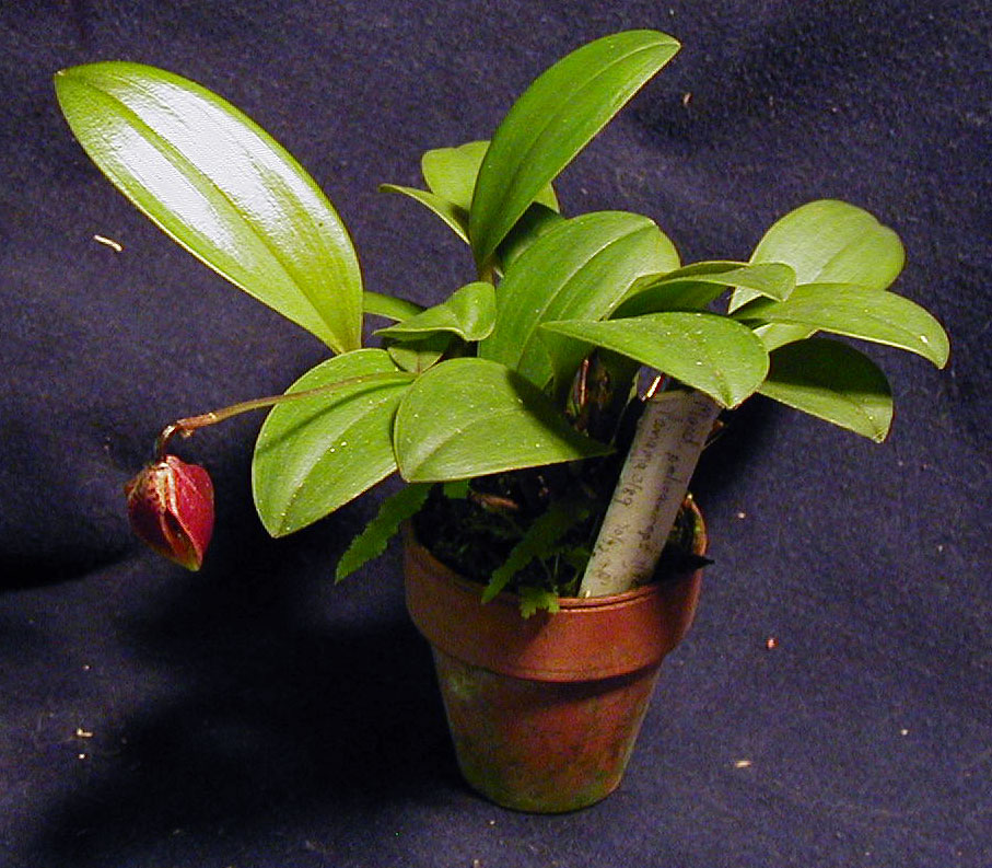 Found in Panama at elevations of 850 to 1000 meters as a small sized, hot to warm growing epiphyte with erect ramicauls enveloped basally by 2 to 3 scarious, tubular sheaths and carrying a single, apical, elliptic, minutely bilobed apically, gradually narrows below into the elongate, petiolate base leaf which blooms in the spring on an erect, single flowered inflorescence that is longer than the leaves and arises from near the apex of the ramicaul and has a tubular bract below the middle and a tubular floral bract and carrying nodding, solitary flowers.
