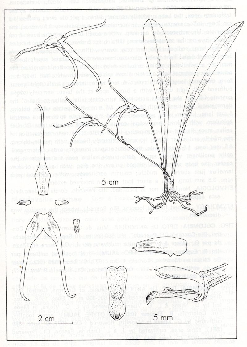 Found in Antioquia department of Colombia in rainforests at elevations of 600 to 800 meters as a mini-miniature sized, warm growing epiphyte with erect, slender ramicauls enveloped by 2 to 3, close tubular sheaths and carrying a single, apical, erect, coriaceous, narrowly obovate, subacute to obtuse, gradually narrowling below into the indistinct petiolate base leaf that blooms in the fall on a slender, erect to suberect, 1.6" to 2.4" [4 to 6 cm] long, single [sometimes successively 2] flowered inflorescence arising from low on the ramicaul with a bract above the base and has a tubular floral bract.
