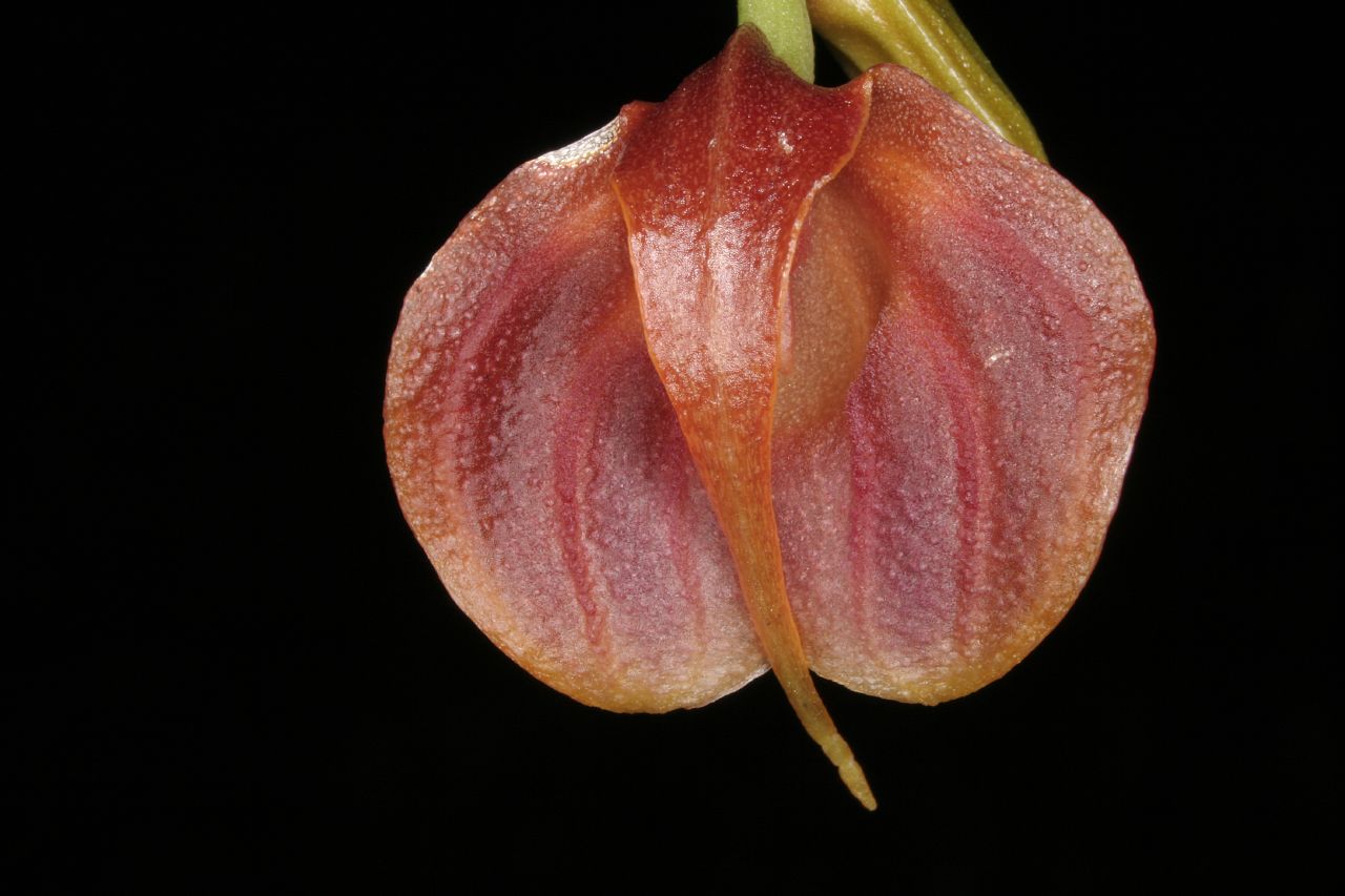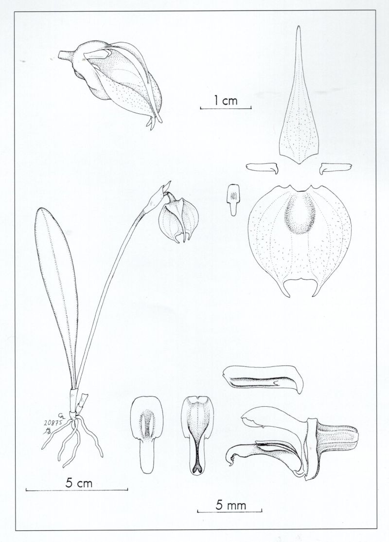Found in southern Ecuador at elevations around 1200 meters as a mini-miniature sized, cool growing epiphyte with erect, slender ramicauls enveloped by 2 loose, tubular sheaths and carrying a single, apical, erect, coriaceous, narrowly elliptical-obovate, subacute, gradually narrowing below into the insdistinct, petiolate base leaf that blooms in the summer on a slender, triquetrous, 3.2 to 4" [8 to 10 cm] long, successively single, few flowered inflorescence arising from low on the ramicaul, with a basal bract and a thin, tubular floral bract.
