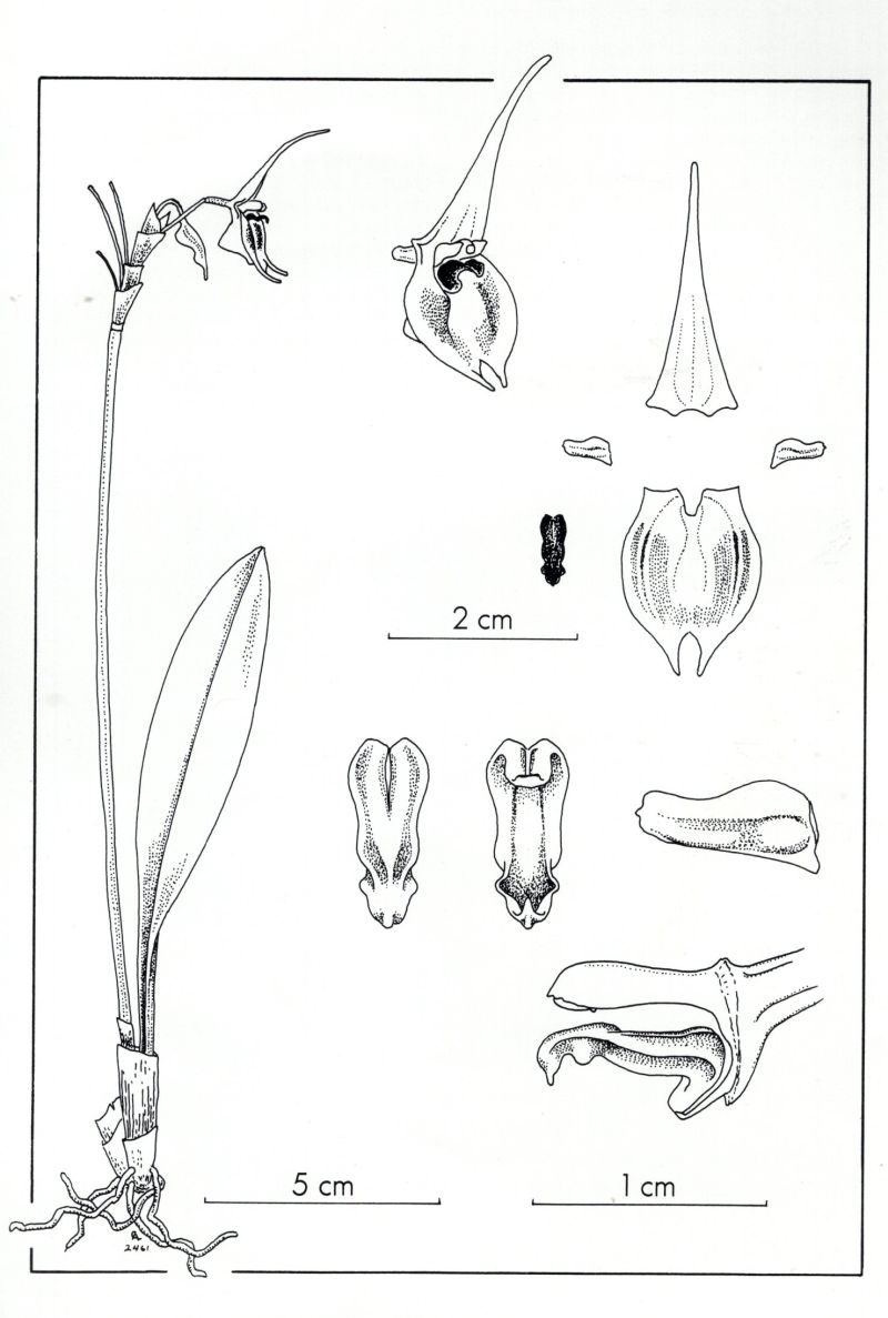 Found in Ecuador at elevations of 1300 to 1500 meters as a miniature sized, cool growing epiphyte with stout, erect, ramicauls enveloped by 2 to 3 loose, tubular sheaths carrying a single, apical, erect, thickly coriaceous, elliptical, subacute leaf that has the base cuneate below into the channeled petiole that blooms in the late spring on a congested, erect, triquetrous, to 12" [to 30 cm] long, successively several flowered, racemose inflorescence arising from the base of the ramicaul with a tubular, basal bract and thin, tubular, imbricating floral bracts and an interesting flower held well above the leaf that has a moveable labellum.