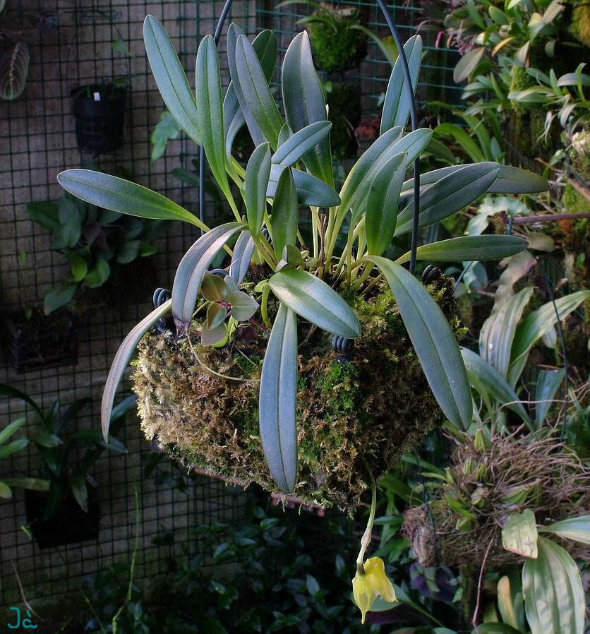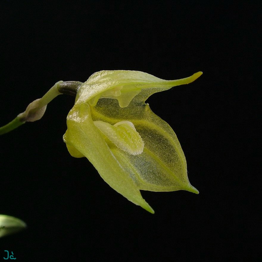 Found in Colombia and Ecuador at elevations around 1300 to 2500 meters as a mini-miniature sized, cool to cold growing epiphyte with erect, blackish, slender ramicauls enveloped basally by 2 to 3 loose sheaths and carrying a single, apical, erect, coriaceous, elliptic, subacute, narrowly cuneate below into the slender, blackish, petiolate base leaf that blooms in the winter and spring on a descending, slender basally thicker above, .8 to 3.2" [2 to 8 cm] long, single flowered inflorescence arising from low on the ramicaul.