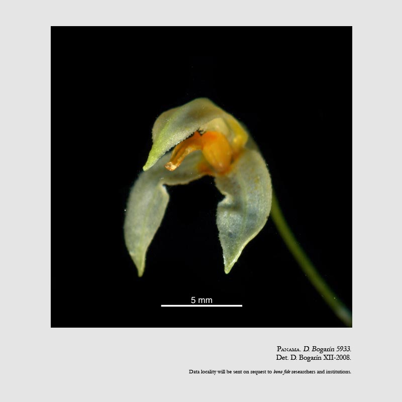 Found in Panama in cloud forests at elevations of 900 to 1000 meters as a mini-miniature sized, warm growing epiphyte with slender, erect ramicauls enveloped by 2 thin, tubular sheath and carrying a single, apical, erect, coriaceous, narrowly obovate, subacute, gradually narrowing below into the petiolate base leaf that blooms in the fall on a slender, erect, 1.2" [3 cm] long, single flowered inflorescence arising from low on the ramicaul with a bract near the base and with a tubular floral bract.