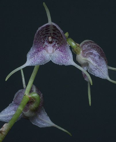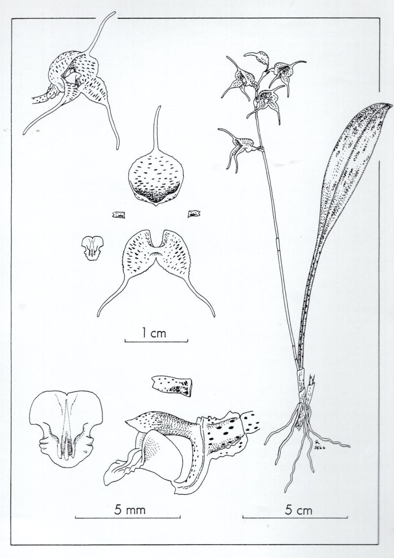 Found in southwestern Ecuador in montane forests at elevations of 1900 to 2650 meters as a miniature sized, cool to cold growing epiphyte with erect, slender, mottled with rose ramicauls enveloped basally by 2 to 3 close, tubular sheaths and carrying a single, apical, erect, coriaceous, dull pinkish tan mottled with purple, narrowly elliptical, subacute, basally narrowly cuneate into the elongate petiolate base leaf that blooms in the fall on a erect, slender, 5.6" to 8" [14 to 20 cm] long, simultaneously opening 4 to 6 flowered inflorescence arising from low on the ramicaul and carrying a bract near the middle and another near the base and has an inflated, oblique floral bract.