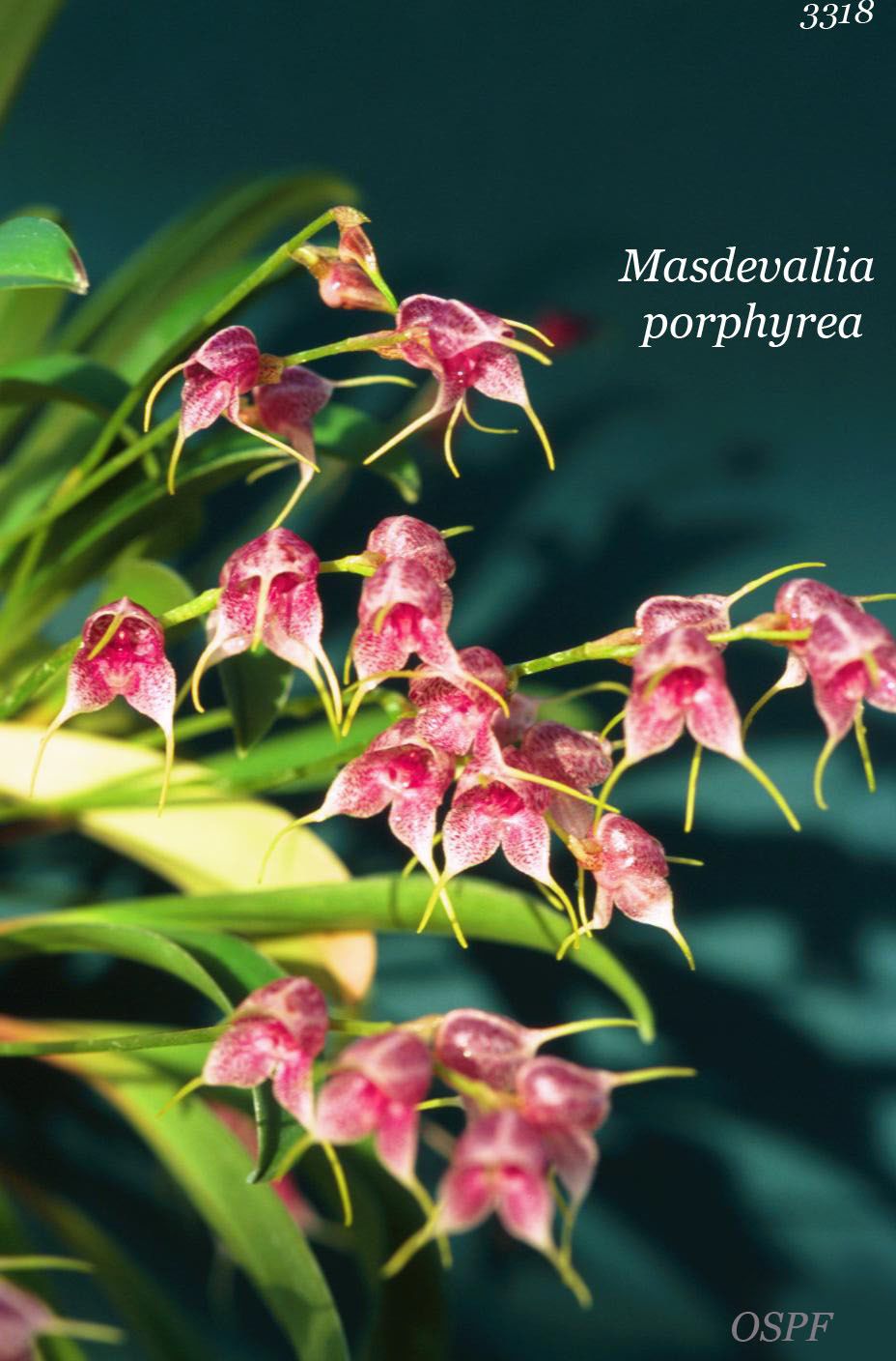 References W3 Tropicos, Kew Monocot list , IPNI ; Masdevallia's in Kleur Vol 1 P M Oversteegen, Eisses & A P Sijm 2001 photo fide; Native Ecuadorian Orchids Vol 3 Dodson 2002 photo fide; Icones Pleurothallidinarum XXV Systematics of Masdevallia Part 5 Luer 2003 drawing fide; Icones Pleurothallidinarum Vol XXVIII Luer 2006 as Spilotantha porphyrea; Orchidaceae Masdevallia and Affiliates Dodson & Luer 2009 as Spilotantha porphyrea drawing fide; Orchids Masdevallia with its segregates including Dracula Zelenko 2014 photo fide;