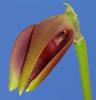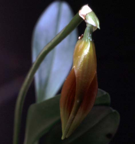 Found in southeastern Ecuador around 1000 to 1700 meters as a miniature sized, cool growing epiphyte with stout, erect ramicauls enveloped basally by 2 to 3, loose, tubular sheaths and carrying a single, apical, erect, coriaceous, elliptical, obtuse, cuneate below into the petiolate base leaf that blooms in the spring and summer on an erect, stout, triquetrous, 5.6 to 7.2" [14 to 18 cm] long, congested, successively single flowered, racemose inflorescence arising from low on the ramicaul, with a bract at the base and imbricating, subacute, broadly conduplicate floral bracts.