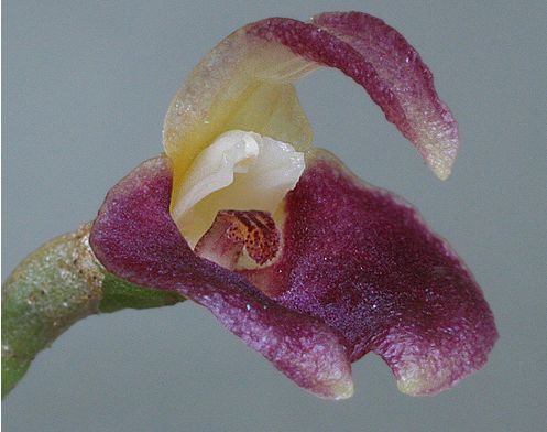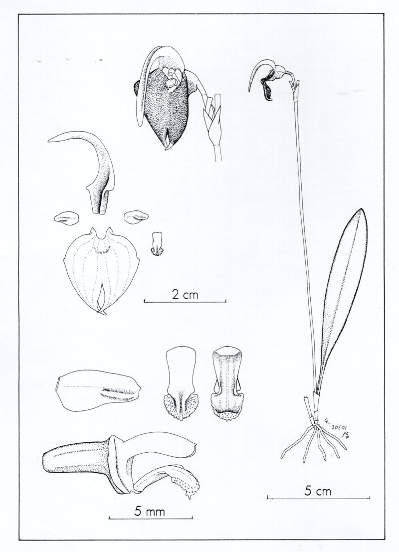Found in southeastern Ecuador without locality but assumed to be in the Amazonas region as a mini-miniature sized, warm growing epiphyte with erect, stout ramicauls enveloped by 2 to 3 tubular sheaths and carrying a single, apical, erect, coriaceous, narrowly elliptical, acute to subacute, narrowing below into the petiolate base leaf that blooms in the fall on an erect, slender, triquetrous, to 8.8" [22 cm] long, successively singel flowered inflorescence arising from low on the ramicaul with a bract near the middle and another near the base and thin, imbricating floral bracts