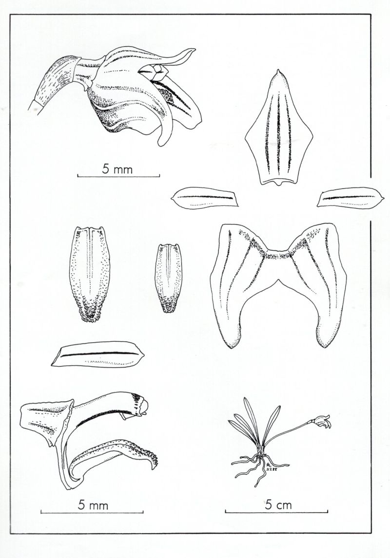 Found in Antioquia department of Colombia in woodlands at elevations of 1600 to 2000 meters as a mini-miniature sized, cool growing epiphyte with slender ramicauls enveloped by 2 to 3, thin tubular sheaths and carrying a single, apical, erect, coriaceous, narrowly obovate-linear, subacute to obtuse, gradually narrowing below into the base leaf that blooms in the winter on a slender, weak, suberect, .6 to 1" [1.5 to 2.5 cm] long, single flowered inflorescence arising from low on the ramicaul with a bract near the base and has a thin tubular floral bract.