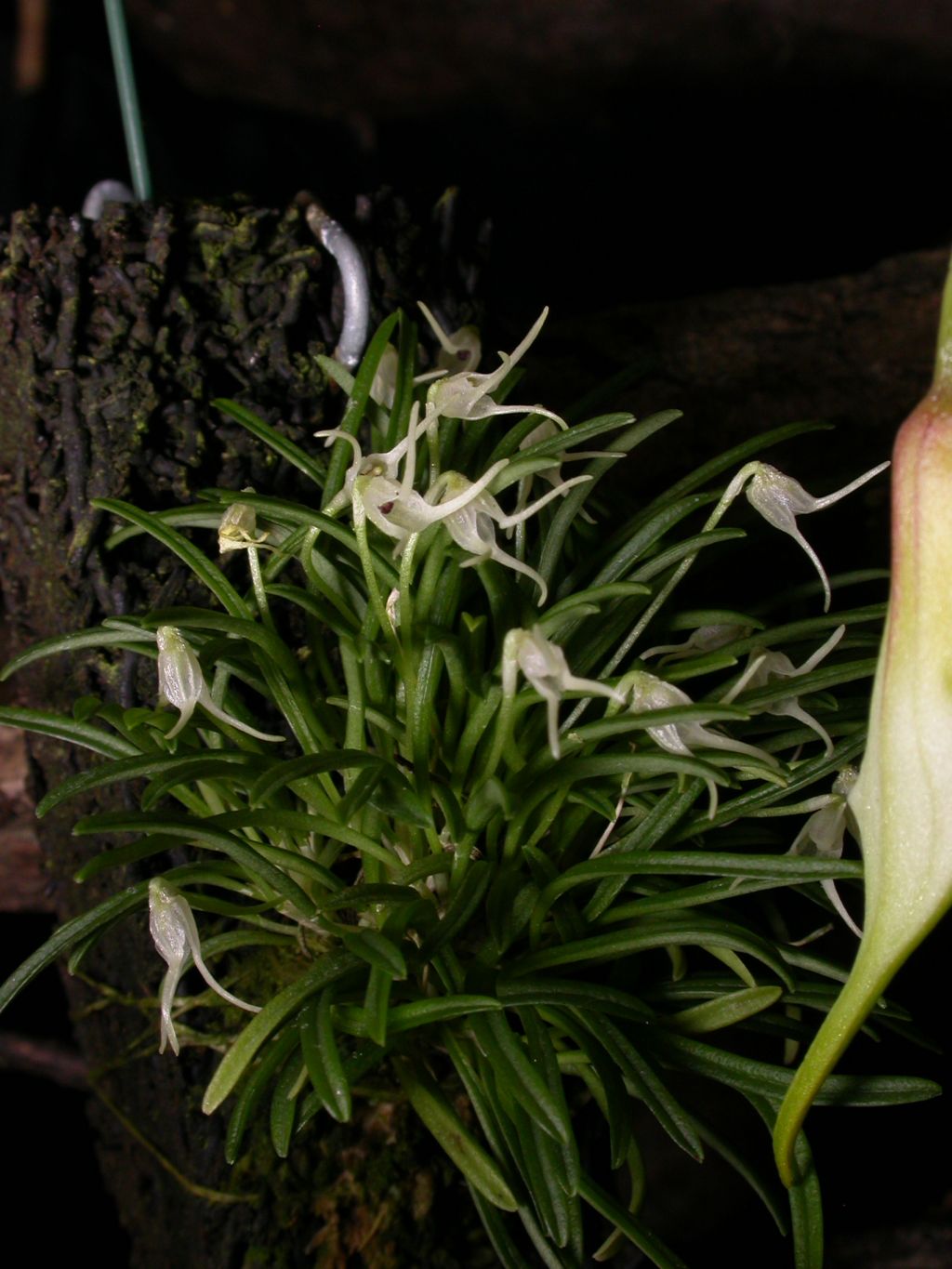 Found in Costa Rica, Colombia and Ecuador in premontane rainforests on shady branches at elevations of 700 to 1600 meters as a mini-miniature sized, warm to cool growing epiphyte with erect, cylindric stems enveloped basally by 2 to 3 loose, tubular sheaths carrying a single, apical, fleshy, linear-lanceolate, apiculate leaf that blooms in the fall and winter-spring on a single flowered, .6" [1.5 cm] long inflorescence and has echinate ovaries and seed capsules.