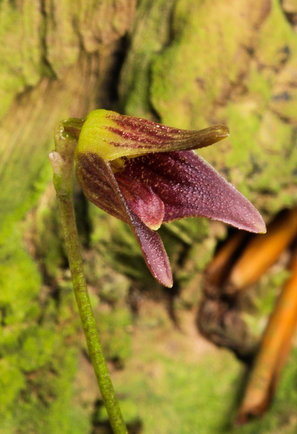 Found in Huanuco department of Peru at elevations around 1200 meters as a mini-miniature sized, cool growing epiphyte with slender, erect ramicauls enveloped basally by 1 to 2 thin, tubular sheaths and carrying a single, apical, erect, coriaceous, narrowly obovate, subacute, gradually narrowing below into the petiolate base leaf that blooms in the winter on an erect, slender, .8 to 1.2" [2 to 3 cm] long, successively single, 2 flowered inflorescence arising from low on the ramicaul, with a bract near the base and a thin, tubular floral bract.