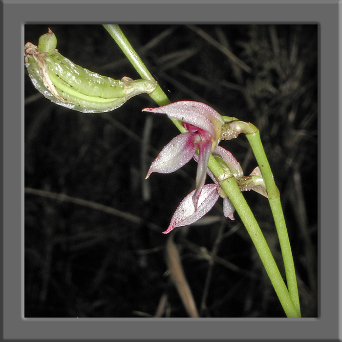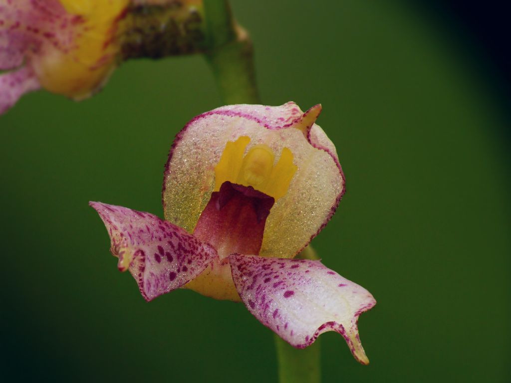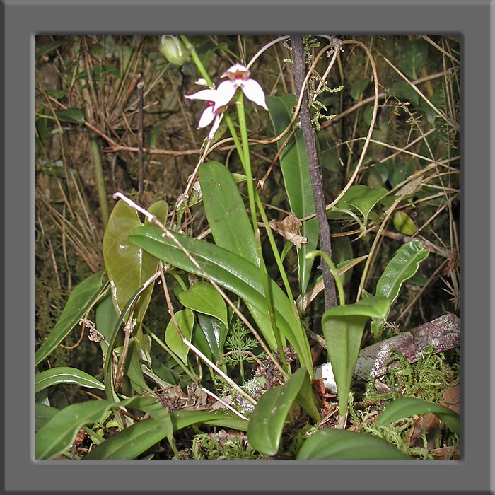 Found in Costa Rica and Panama in wet montane and cloud forests at elevations of 1500 to 3000 meters as a mini-miniature sized, cool to cold growing epiphyte with somewhat stout, ramicauls enveloped basally by 2 to 3, loose tubular sheaths and carying a single, apical, erect, coriaceous, narrowly elliptical-oblong, subacute to obtuse, gradually narrowing below into the indistinct, sulcate, subpetiolate base leaf that blooms in the spring on a slender, suberect, 5 to 8" [12.5 to 20 cm] long, simultaneously few [3 to 8] flowered, slightly flexuous inflorescence arising from low on the ramicaul with 2 to 3 distant bracts and inflated, acute floral bracts,