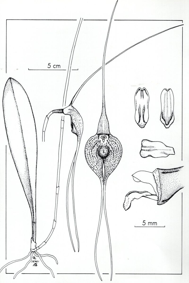 Found in Peru at elevations of 1000 to 1500 meters as a miniature to small sized, cool growing epiphyte with stout, erect ramicauls enveloped by 2 to 3 tubular sheaths carrying a single, apical, erect, thickly coriaceous, narrowly obovate, obtuse leaf that is gradually cuneate below into the base where it blooms in the winter on a congested, successively few flowered, racemose, terete, 12" [30 cm] long inflorescence arising from low on the ramicaul with 3 to 4 close bracts below the middle and a thin, tubular floral bract holding the flower well above the leaf.